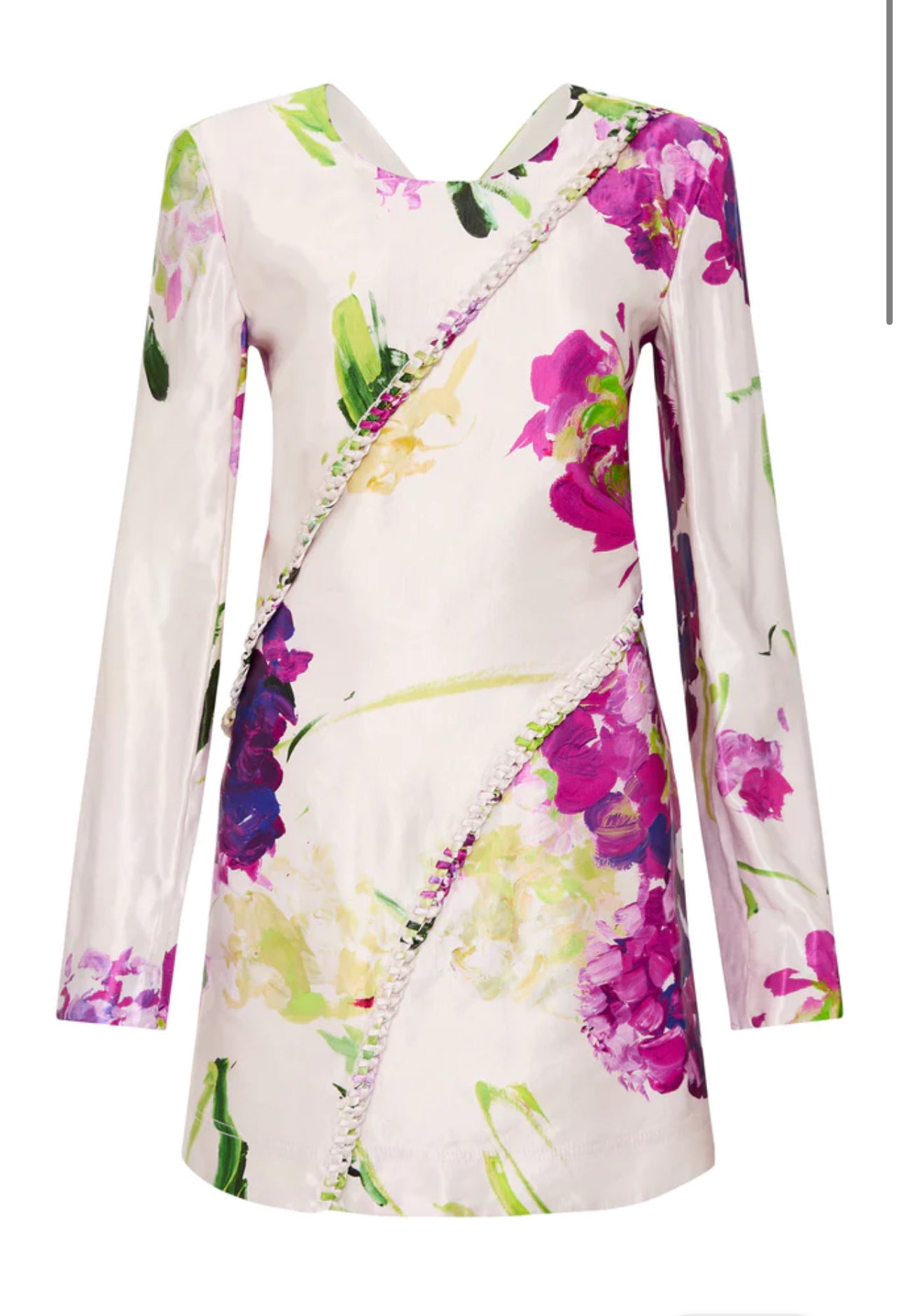 Exclusive, unique print placement on each piece Mini dress Straight fit Crew neckline V-neck back Shoulder pads Functional sleeve zips Curved exposed seams Zip, hook and eye closure Lined