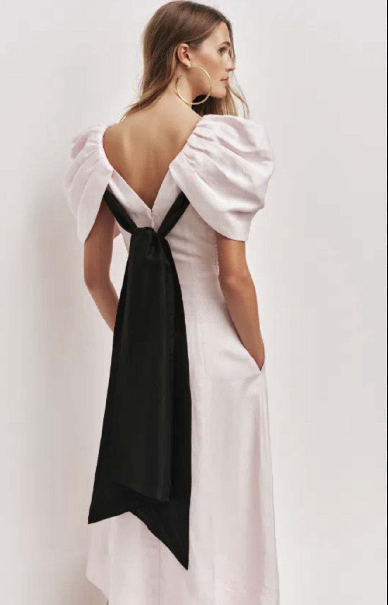 Women's midi dress V-neckline Sculptural puff sleeve with tucks Fit-and-flare silhouette Zip, hook and eye closure Lined style