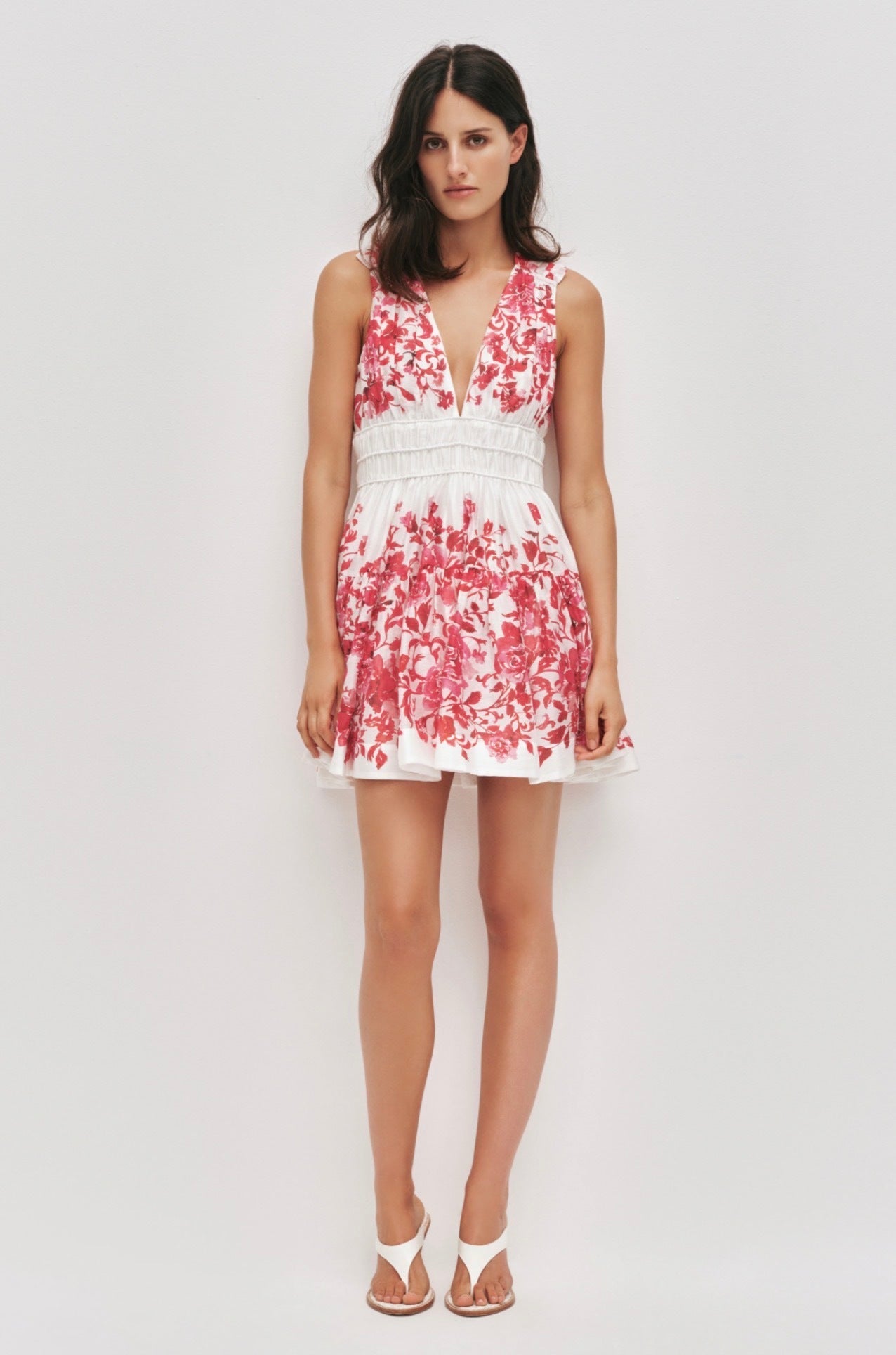 Women's mini dress V-neckline Gathered shoulder straps Elasticated waist panels Gathered tier through skirt Tie back neck detail Zip, hook and eye closure.