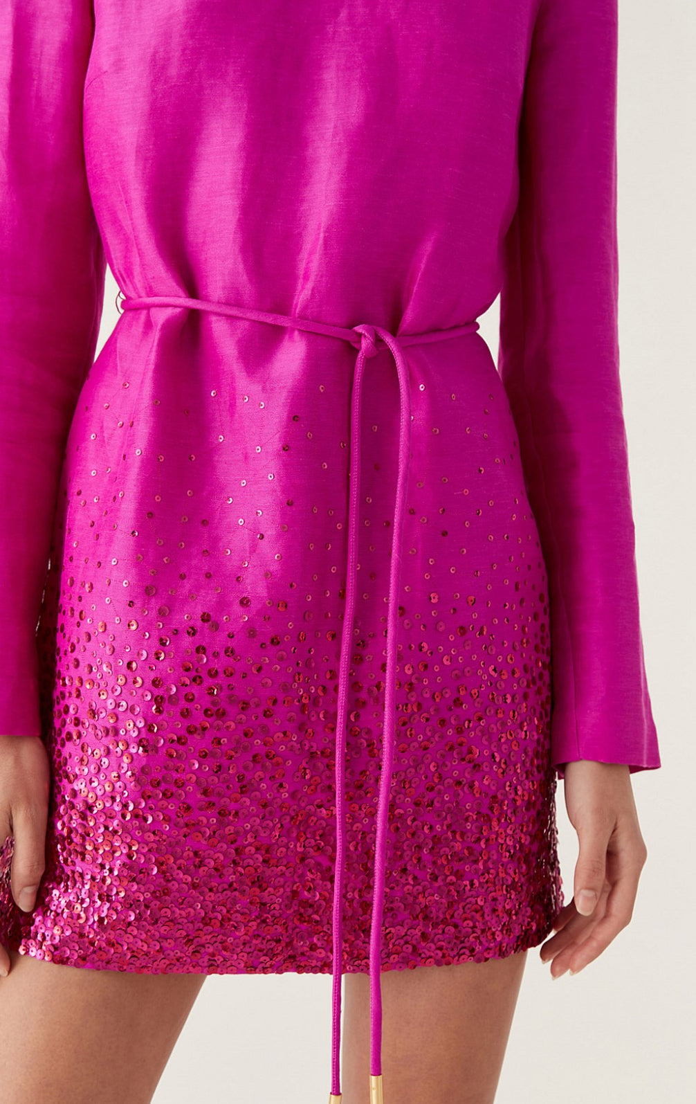 Women's mini dress Column silhouette Crew neckline Long sleeves Detachable self-tie belt Ombré hem sequins Zip, hook and eye closure Line