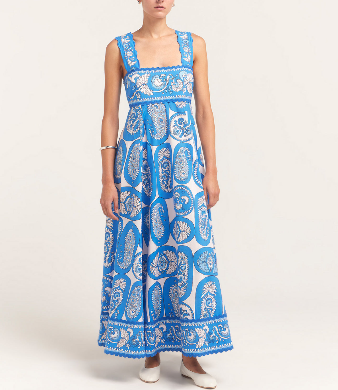 Make a statement with the Dianna Summer Dress, a flowing maxi crafted in a striking blue and white paisley-inspired print. Featuring a square neckline and thick, scalloped-edge straps, this dress presents intricate detailing running along the bust and hemline. With a structured bodice and a relaxed, full skirt, the Dianna Summer Dress is perfect for sunlit gatherings. Square neckline Thick, scalloped-edge straps Maxi length