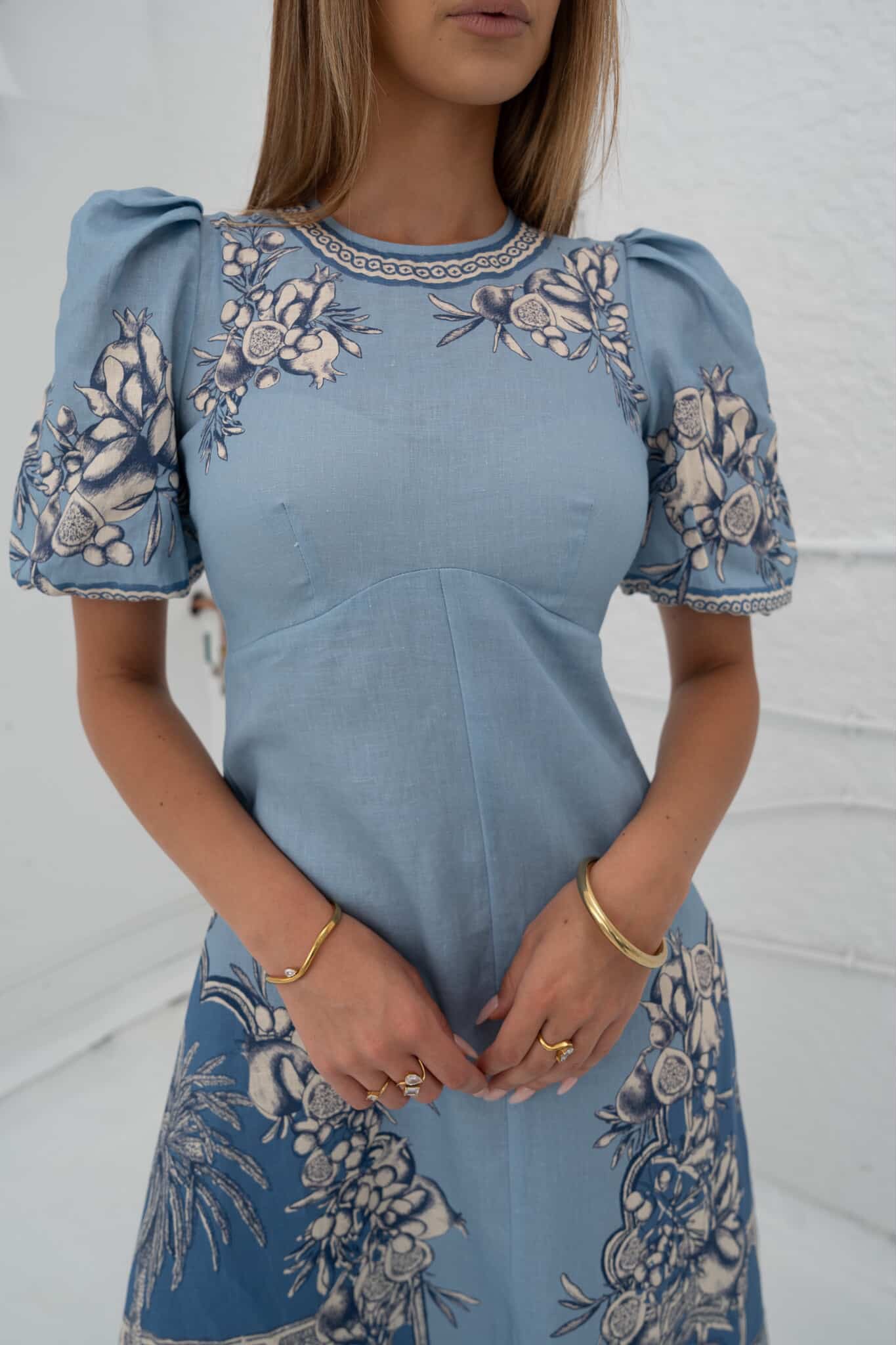 Relaxed midi dress Fitted bodice Puff sleeve with tucks A-line panelled midi skirt Back invisible zipper Refer to size guide for garment measurements 100% European Linen