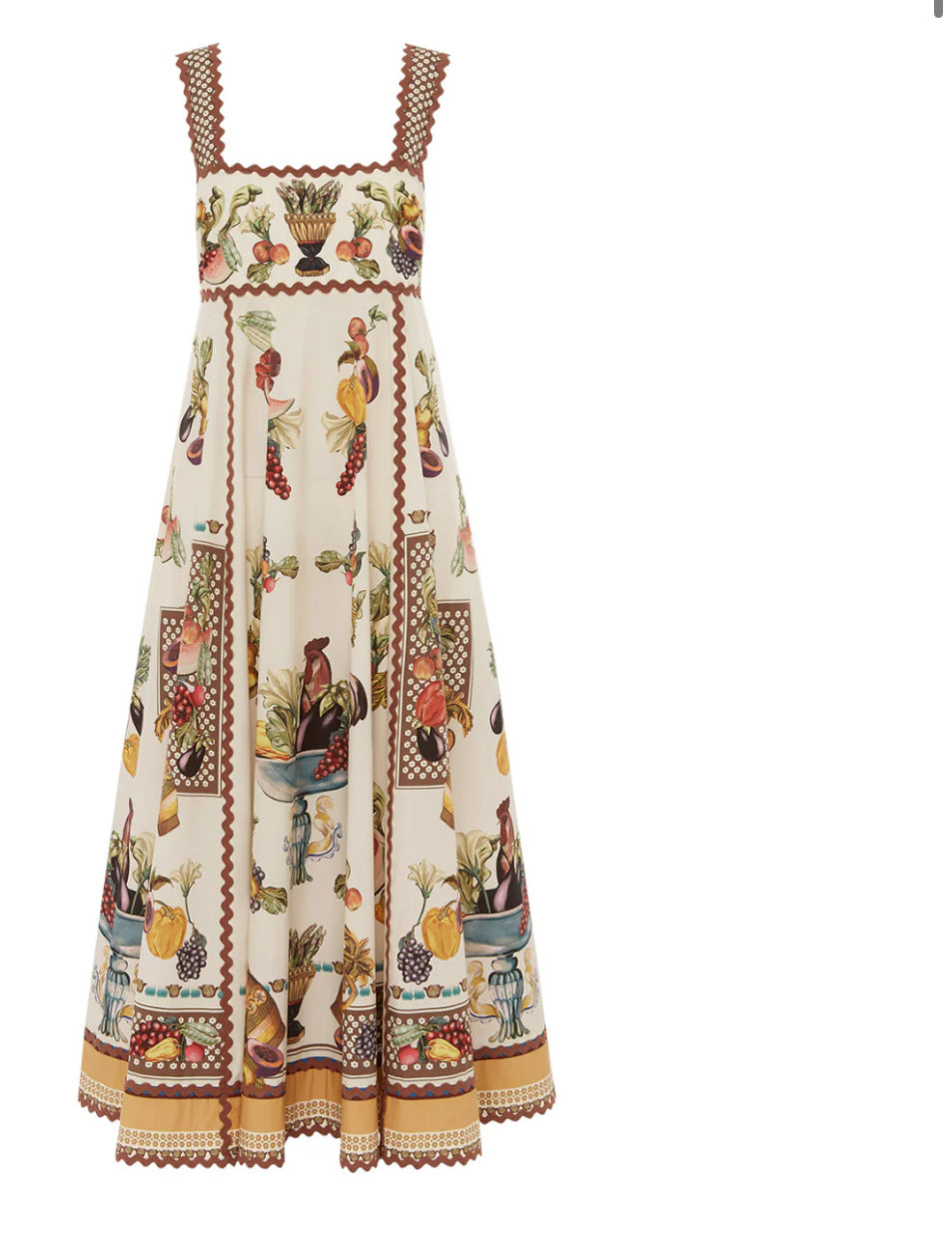 Introducing Alemais's EXCLUSIVE Mercado Summer Dress. A cotton poplin midi-length sundress silhouette. Crafted with a square neckline and wide ric-rac straps. The dress features a vintage-style market print featuring hand-painted fruits, vegetables, and kitchenware in vertical panels, framed with rust-brown scalloped borders for a rustic Mediterranean countryside aesthetic. Midi-length silhouette Contrast ric-rac trim Invisible side zip Inseam pockets Relaxed fit; recommend taking your true size 100% Organic Cotton Poplin