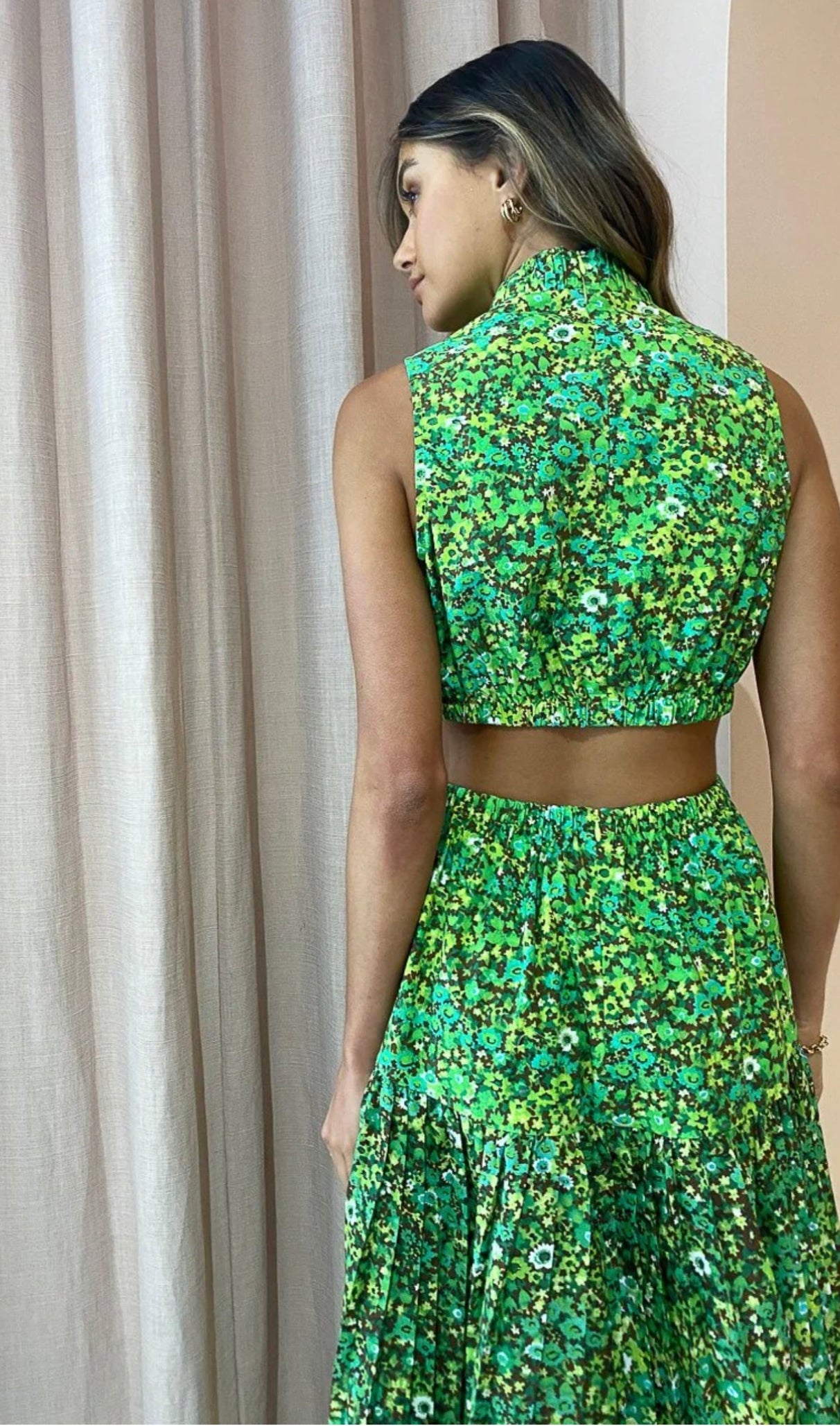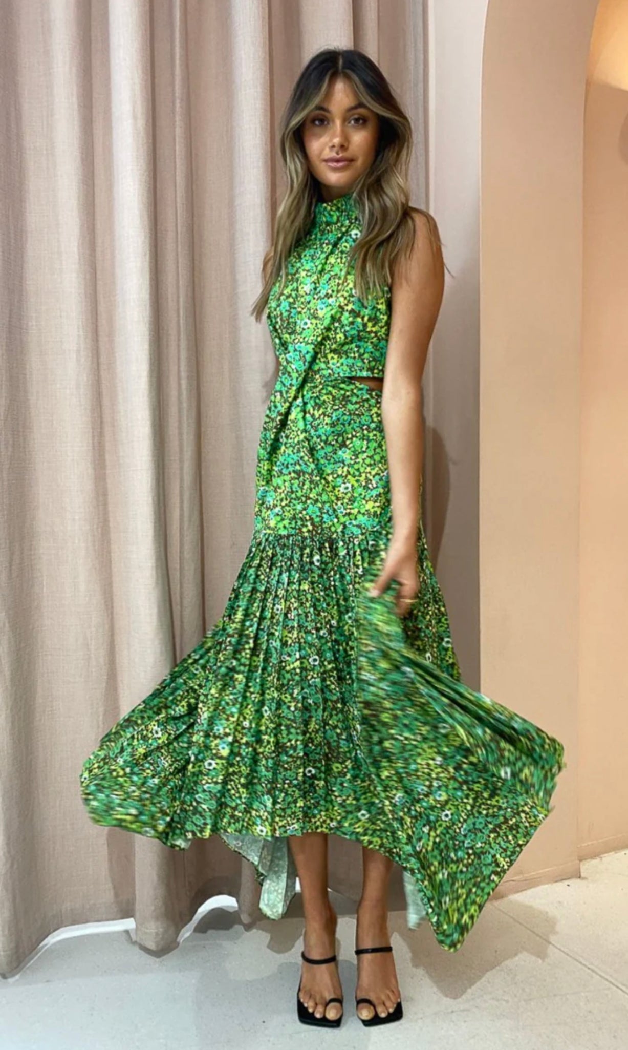 Alemais is adding a twist to coveted silhouettes with the Phyllis Twist Front Pleat Dress in Acid Green. Crafted from a Cotton Poplin fabrication, this midi dress features a high neck, twist front detail and waist cut outs which falls elegantly into a handkerchief hem pleated skirt. Turning heads with its abstract ditsy print and unexpected back cut out, the Phyllis will brighten up those birthday celebrations and twilight cocktail.