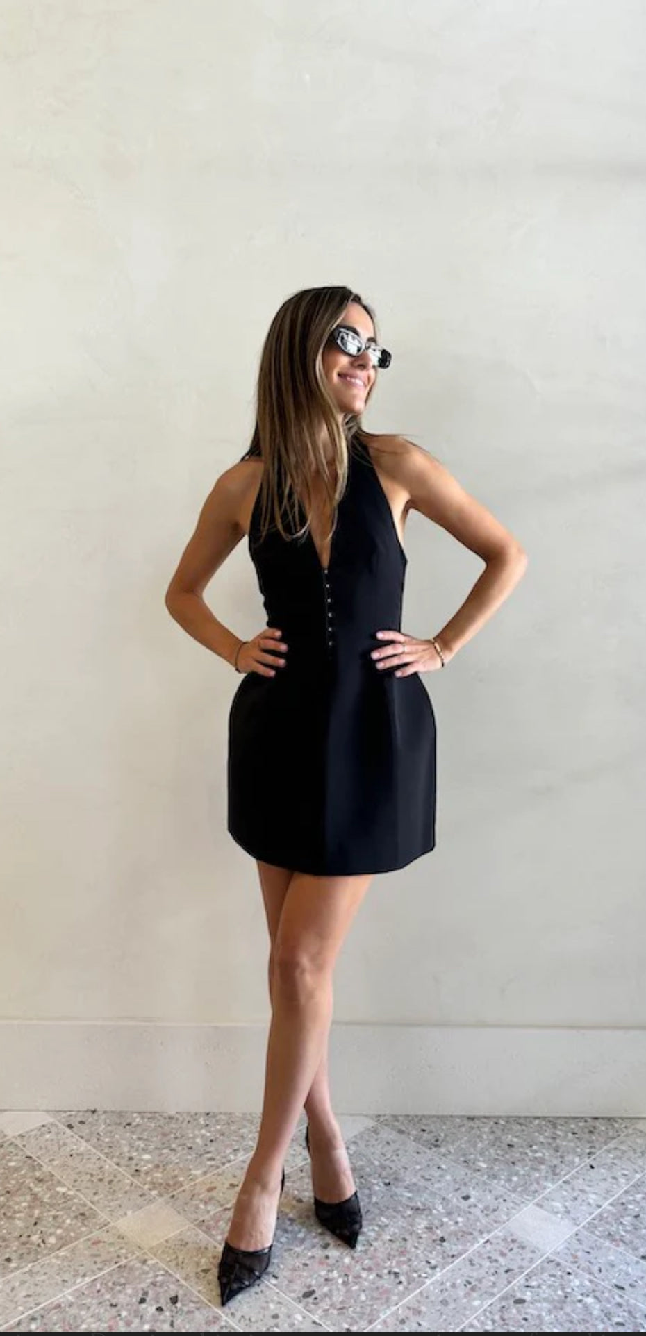 A mini dress with a halter neckline exudes timeless allure, while the sculpted silhouette celebrates the female form with elegance and grace. Elevating the ensemble, the centre front hook and eye detail adds a touch of edge that's impossible to ignore.