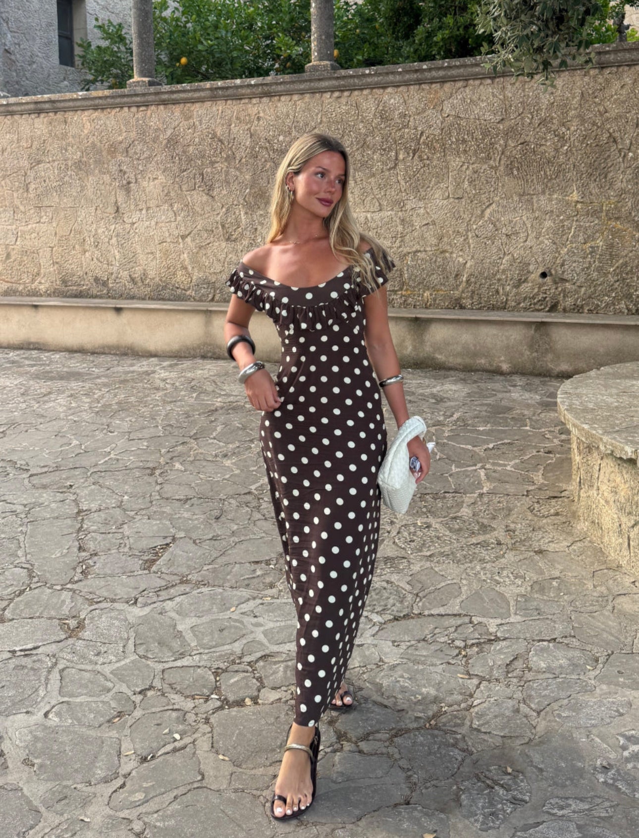 A feminine maxi dress with a timeless polka dot pattern. The design features a flattering fit with delicate ruching details at the shoulders and an elegant open back that adds a modern twist. The delicate tie straps at the sides highlight the waist, creating a beautiful silhouette.