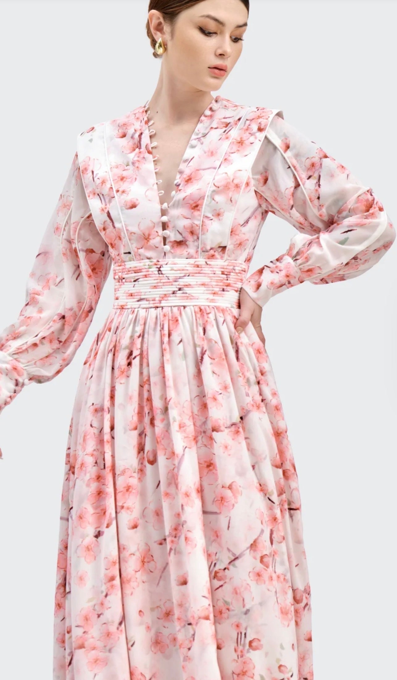 The best-selling Xander Mini Dress, has been reimagined with an evening-style maxi dress twist. Showcasing precise tailoring, intricate piping, floaty full-length skirt, and covered button neckline, the Xander Maxi Dress in peach blossom incorporates all the classic Xander details with a feminine springtime update. The wide covered rope belt works to cinch the waist before bursting into an hourglass silhouette with the structured v-neck and billowing skirt.