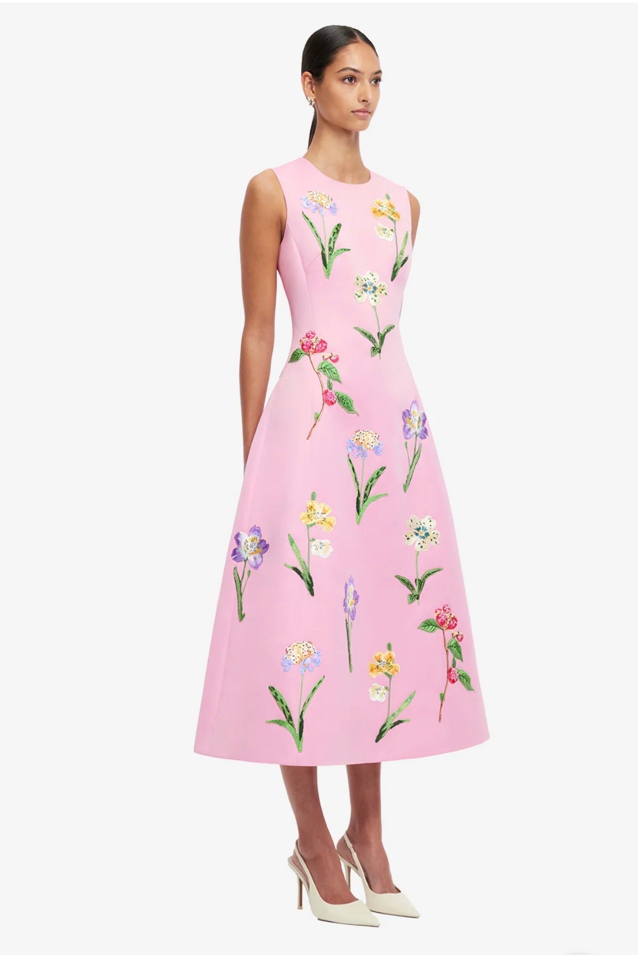 Capture the carefree beauty of wildflowers in full bloom. Bursting with colour, rendered on a flamingo pink base, and delicately beaded, the Wildflower Print feels like a modern day fairytale. Premium sleeveless midi dress Exclusive LEO LIN Wild Flower in Flamingo Print 3D bead embroidery Round neckline Fitted waist A-line silhouette Invisible back zip closure Full lining