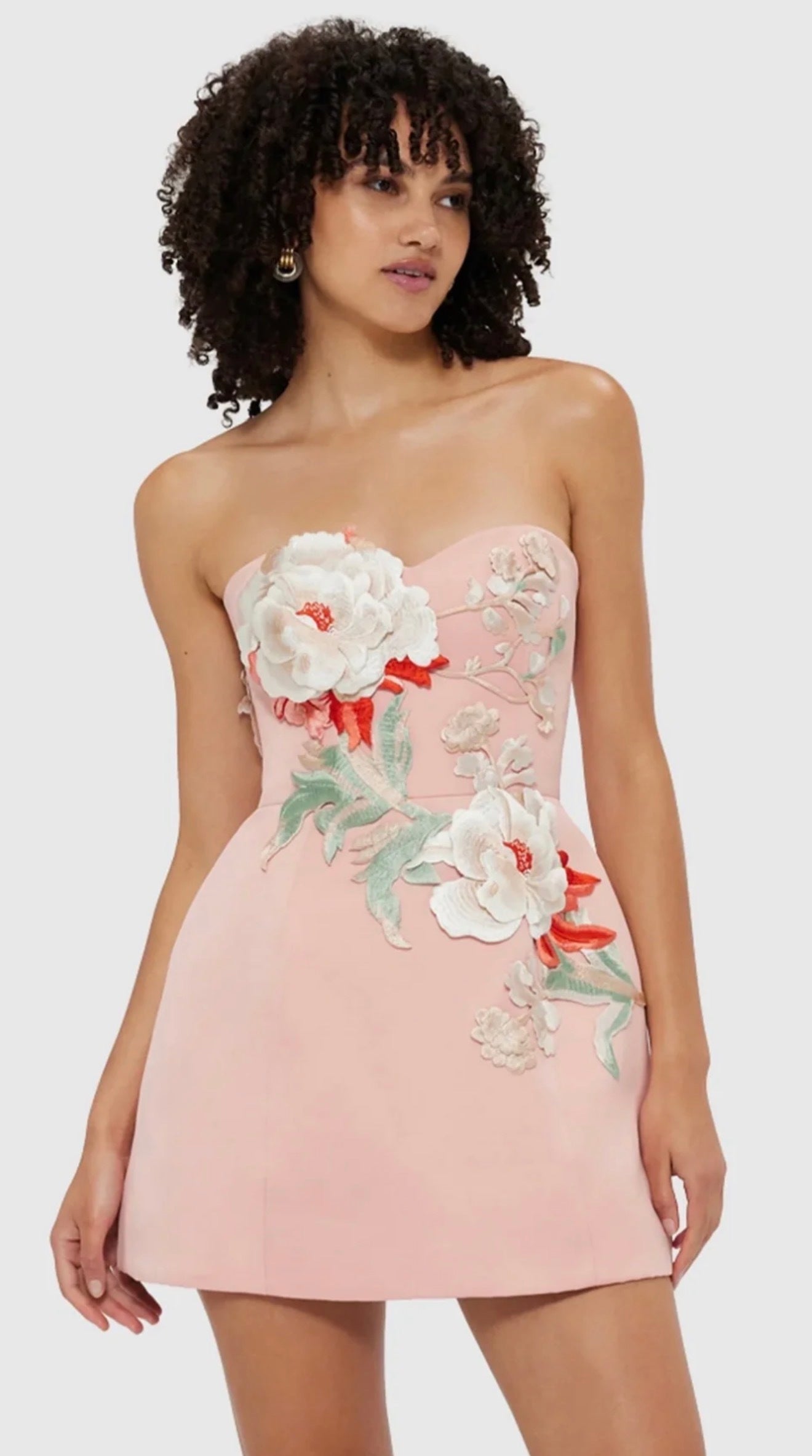 Hand painted peonies in pinks and scarlets playfully dance on a blush canvas, seen as symbols of prosperity and love. Premium strapless mini dress Exclusive LEO LIN Peony Print appliqué design Sweetheart neckline Fitted bodice & waist A-line mini skirt Invisible back zip closure Full lining