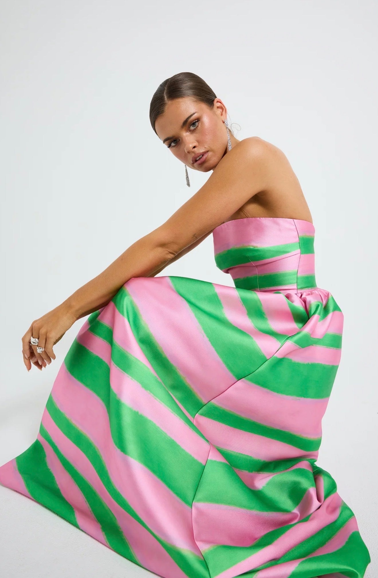 The Gigi Strapless Midi by PASDUCHAS is crafted from a lustrous-finish taffeta, featuring an exclusive green and pink stripe print. It showcases a strapless neckline with boning, cinched at the waist before flaring into a full midi-length skirt complete with pockets. The piece is secured with a centre-back concealed zip fastening for comfort and ease of fit.
