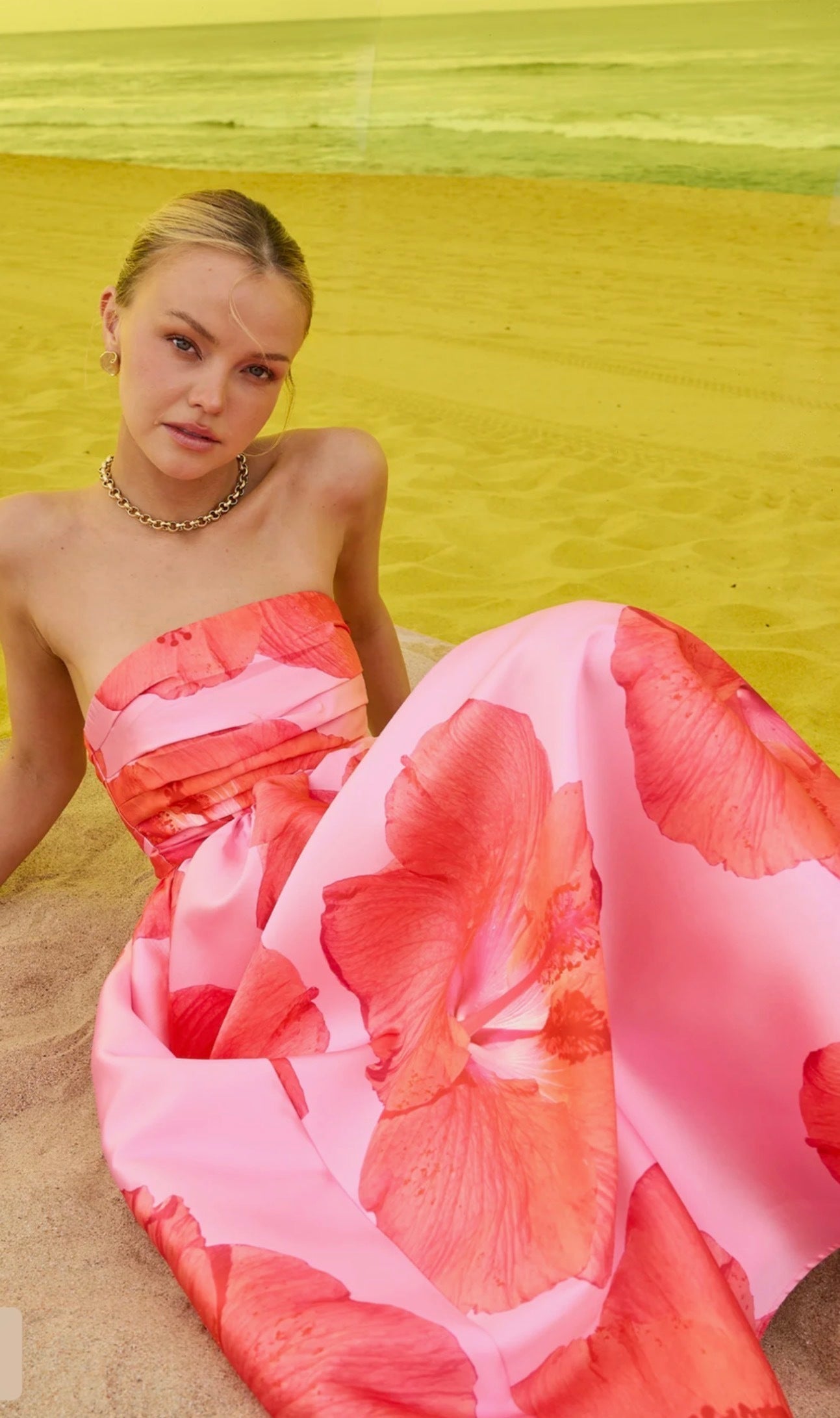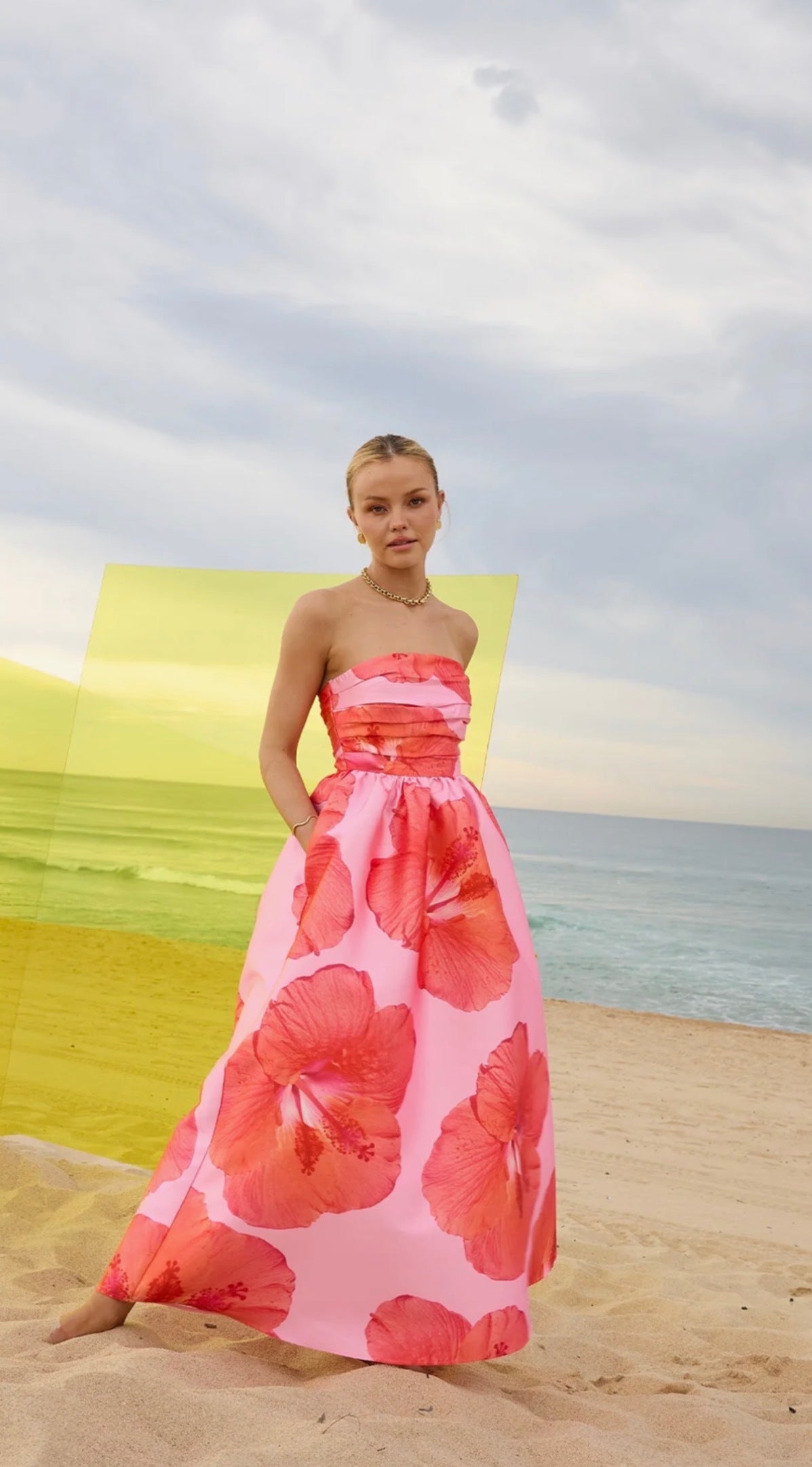 The Kalani Strapless Midi by PASDUCHAS is crafted from lustrous taffeta featuring an exclusive hibiscus floral print. The strapless neckline is detailed with textural tucks through the bodice to create a flattering shape, cinched at the waist before flaring into a full midi-length skirt complete with pockets. The look is finished with a concealed centre-back zipper for ease of fit and comfort.