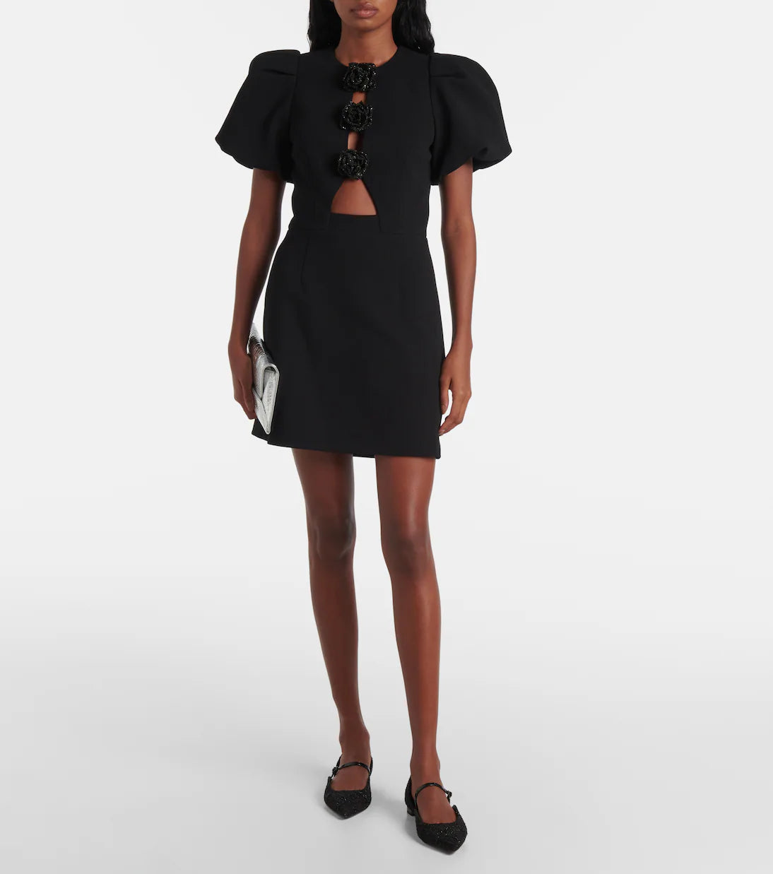 The Aubree Flower Mini Dress in black is a refined and classic dress, adorned with hand-embellished diamante floral details. Its rounded neckline and fitted bodice with front cutouts complement the cinched waist structure, enhanced by voluminous short puff sleeves for an added touch of style. This A-line dress is fully lined and comes complete with a zip fastening at the back, ensuring comfortable and effortless wear.
