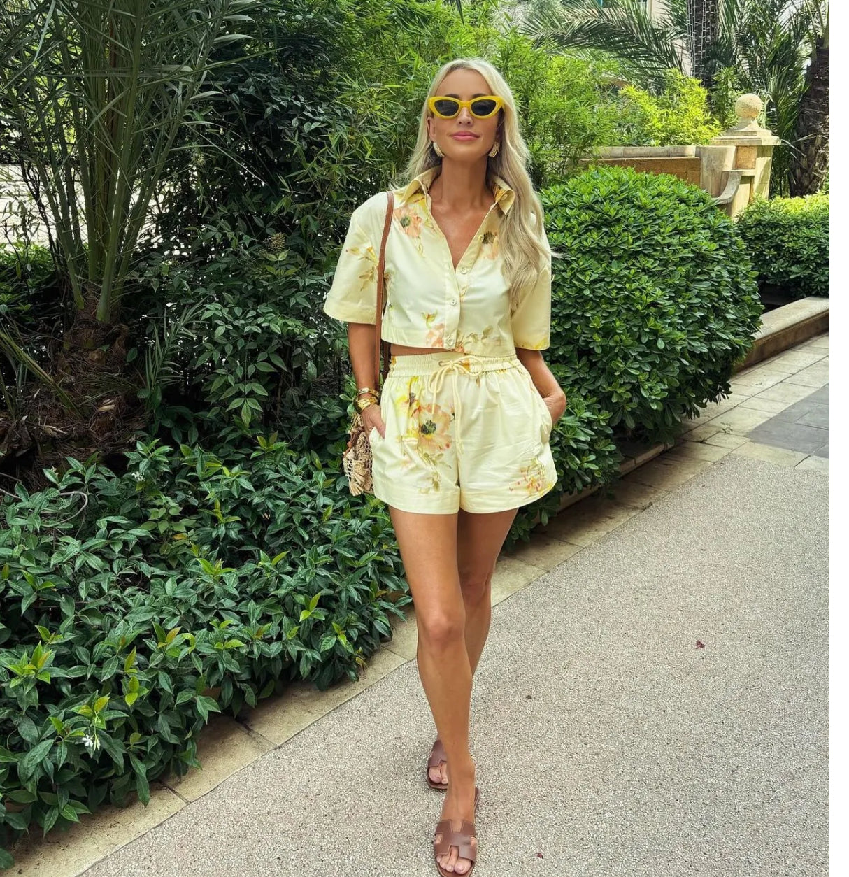 Zimmermann Lightburst Relaxed Crop Shirt Size 3 & Shorts Yellow Print Size 2 . A cotton cropped shirt featuring wide short sleeves and buttons down the centre front. Shirt details: Cotton crop shirt Classic collar Self cover buttons down the centre front Short sleeves A cotton short featuring an elasticated waist and side seam pockets. Short details: Cotton short Drawstring cord with toggle ends Elasticated waistband Side seam pockets
