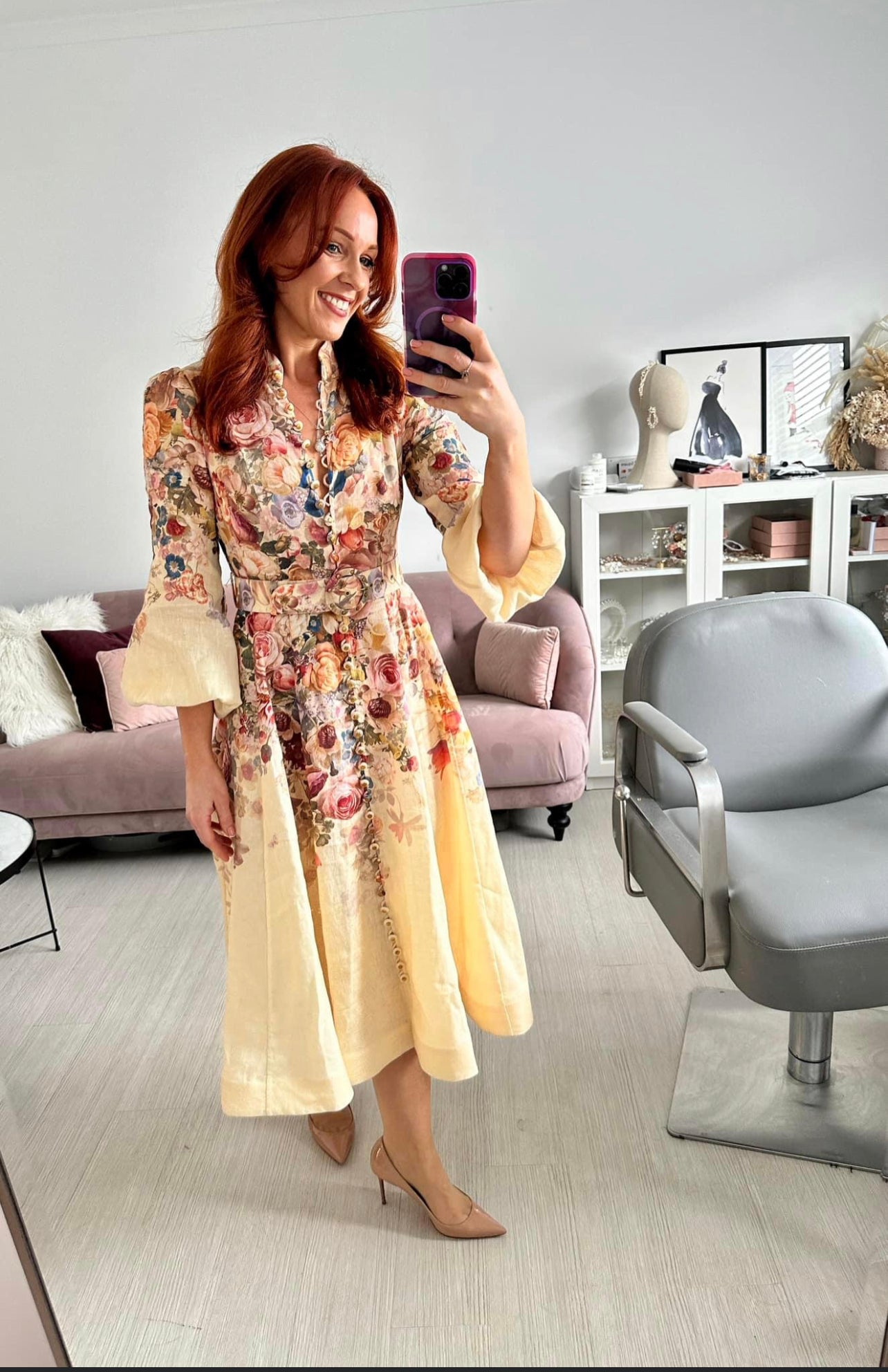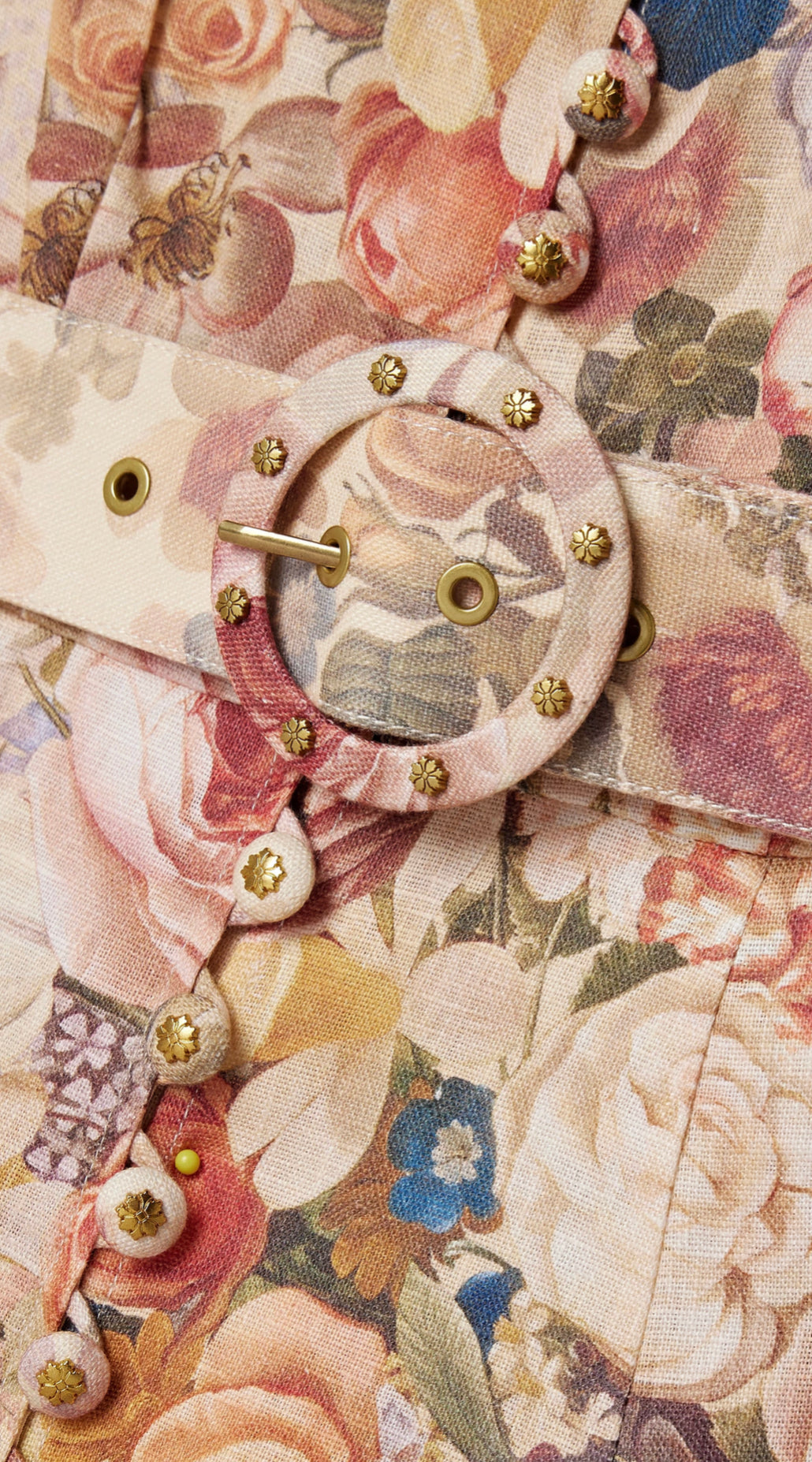 The Luminosity Buttoned Midi Dress in Morisot Cream Print from our Fall 2023 Collection, Luminosity. A linen midi dress featuring blouson sleeves, high stand collar and buttons down the centre front. Linen midi dress Blouson sleeves with elastic cuffs Side seam pockets Removable belt Invisible zip closure