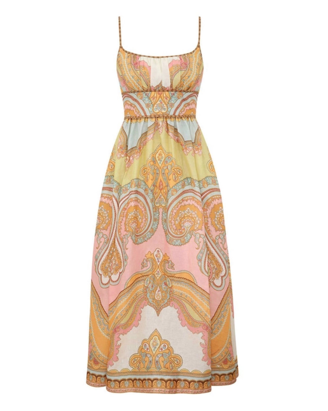 The Maxine Picnic Midi Dress in Gold Paisley from our Resort Swim 2025 Collection. A linen midi dress featuring a fitted bustier with heavy gathering, a shirred back bust and self tie shoulder straps. Linen midi dress Placement print Self tie shoulder straps with toggles Flat piping inserts Invisible zip at centre back