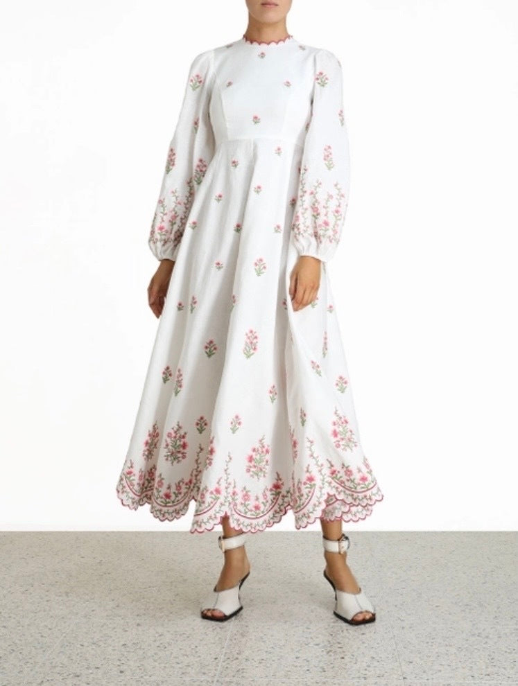 The Poppy Floral Midi Dress in Pink Embroidery from our Resort 2021 Collection. A linen midi dress featuring an embroidered, scalloped neck and hemline and placement floral embroidery throughout. Size 1 which fits size 8-10.