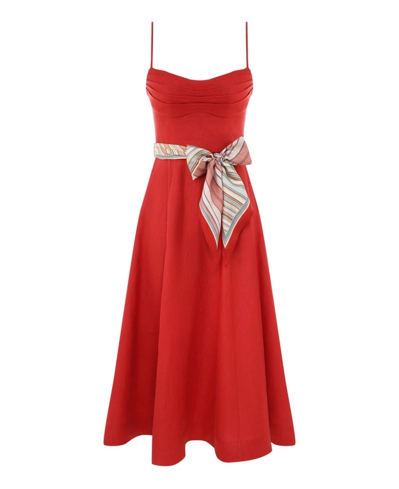 The Rebellion Tuck Midi Dress in Red from our Cruise 2026 Collection, Twisted Romance. A linen midi dress featuring drape detailing across the bust, adjustable straps, finished with a full flare skirt.